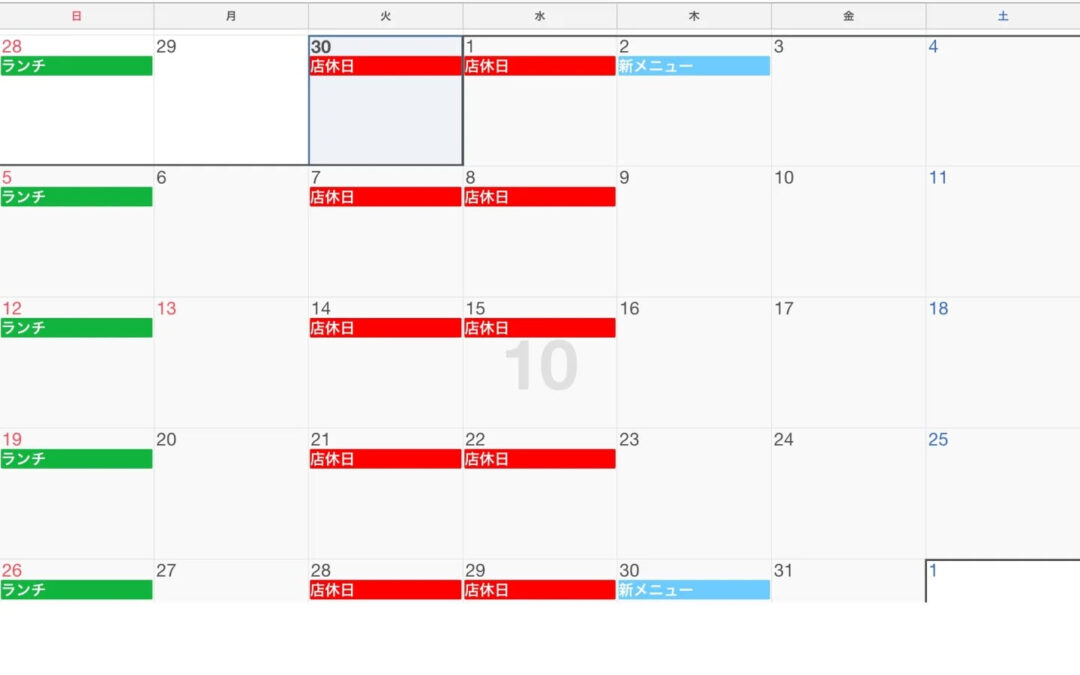 10月の予定表です。10月は火曜、水曜とお休みさせて頂きます。